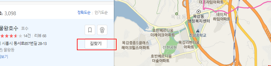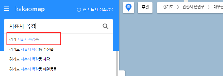 기본적으로 일단 저는 안산시에 사는데요. 대부동 부분에 있어서 어제부터 확인을 하면 되는데요. 일단 가고자 하는 것을 검색하여 줍니다. 저는 시흥시 목감에 있는 물왕저수지를 검색해볼 거예요.