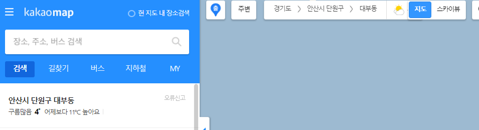 먼저는 다음 지도에 오게 되면 장소 및 주소, 버스 등 검색하는 부분이 보이게 됩니다. 여기서 검색을 하여 주면 되는데요.