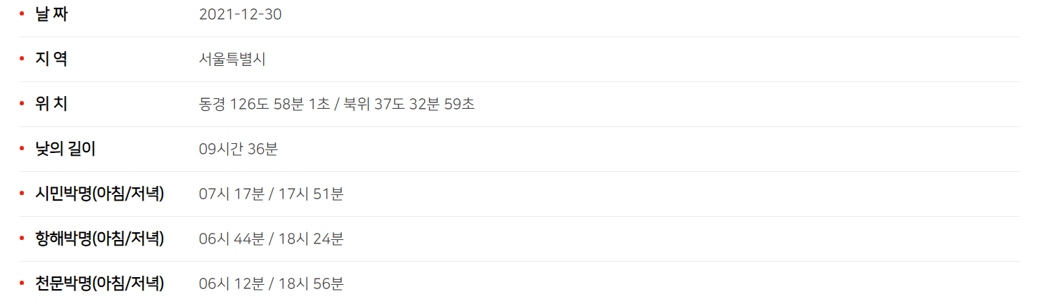 날짜, 지역, 위치, 낮의 길이가 나오고 그리고 이제 낮의 해뜨는 시각 그리고 한낮의 시각 그리고 해지는 시간이 나옵니다. 서울 기준으로 일출 시간, 일몰 시간은 각각 7시 46분 일출시간, 5시 22분 해지는 시간 입니다.
