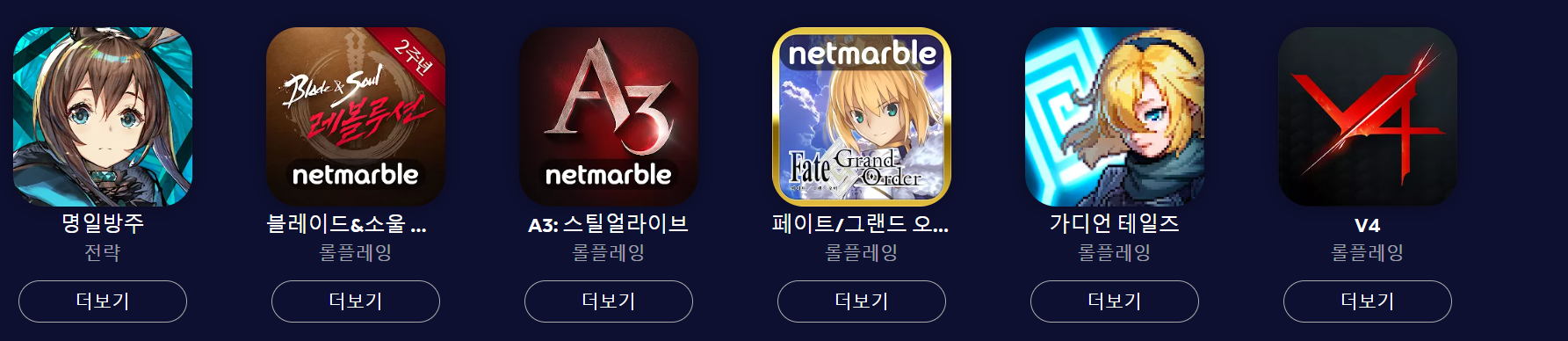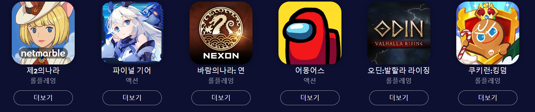 더보기 부분으로 총 12가지를 보고 알수가 있습니다. 명일방주, 블레이드, a3,페이트 가디언, v4, 파이널기어, 어몽어스, 오딘, 등등으로 보면 알수가 있는데요.