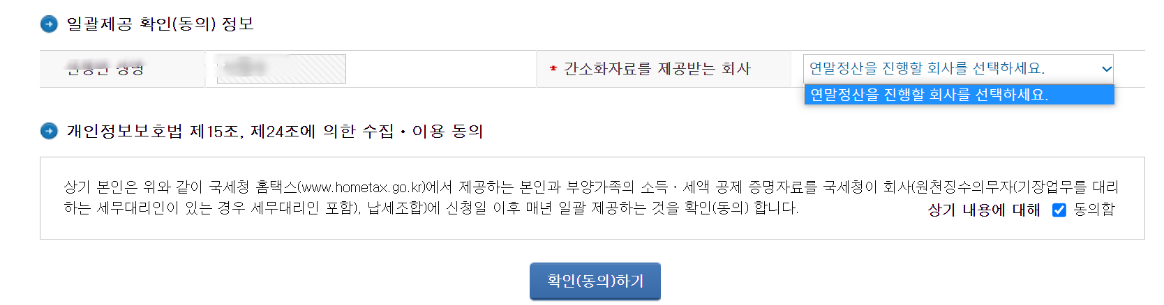 일괄 제공동의만 근로자 입장에서 하게 되면 국세청에서 일괄 회사에 자료 정보 제공을 하게 됩니다. 이것이 올해 바뀐 여말정산이기도 합니다.