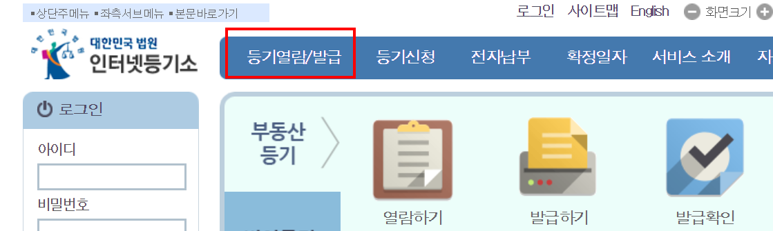 일단 로그인도 필요로 하고 가장 상단 메뉴에 보면 등기 열람/ 발급 메뉴가 있습니다. 그러면 화면을 보면서 하나 체크해보도록 하겠습니다.